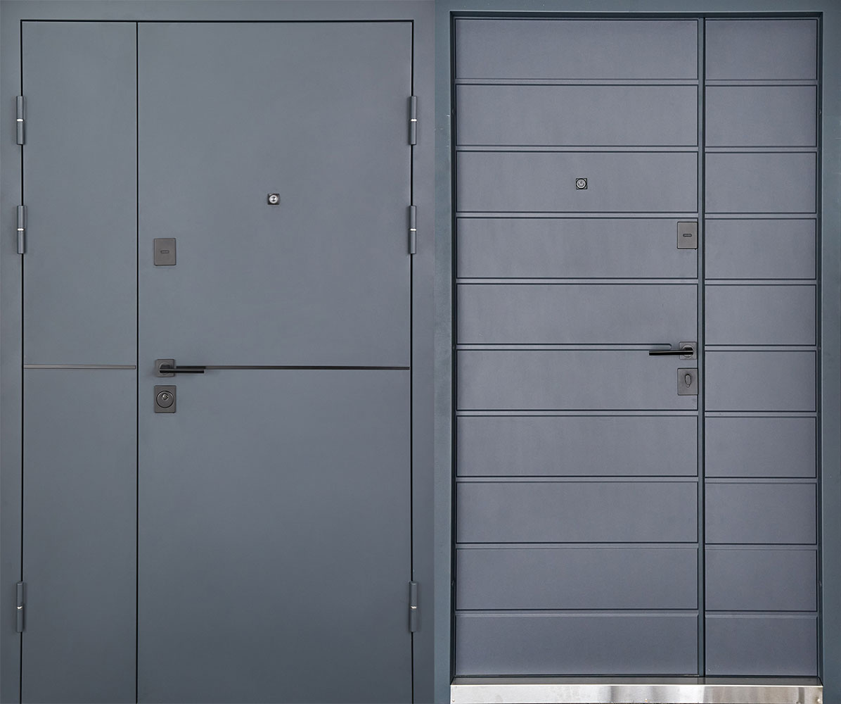 Дверне полотно завтовшки 90 мм забезпечує надійність і комфорт. Усередині — МДФ-накладка завтовшки 10 мм і металевий лист завтовшки 1,5 мм, що гарантує тишу та захист. Зовнішнє покриття — міцний метал із молотковим фарбуванням, стійке до будь-яких погодних умов. Конструкція з 11 горизонтальними ребрами жорсткості робить двері надзвичайно міцними.