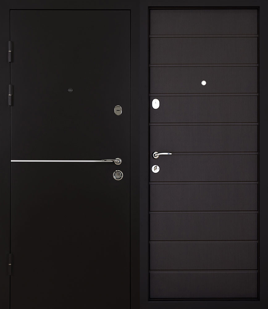 Дверне полотно завтовшки 90 мм забезпечує надійність і комфорт. Усередині — МДФ-накладка завтовшки 10 мм і металевий лист завтовшки 1,5 мм, що гарантує тишу та захист. Зовнішнє покриття — міцний метал із молотковим фарбуванням, стійке до будь-яких погодних умов. Конструкція з 11 горизонтальними ребрами жорсткості робить двері надзвичайно міцними.